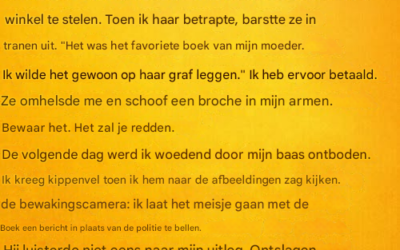 VERHAAL 1 — HET BOEK DAT NIET GESTOLEN HAD MOETEN WORDEN Een rustige plek waar we ons veilig voelden. De…