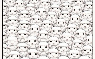 Op het eerste gezicht lijkt de afbeelding simpel: een veld vol schattige, cartoonachtige schapen. Maar tussen de open deuren zitten…