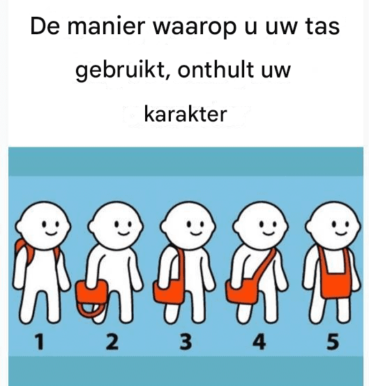 2. In de hand dragen Als je je tas en andere spullen graag in de hand draagt, betekent dit dat je graag alles zelf regelt en overal de controle over hebt. Je wilt altijd op de hoogte zijn van wat er speelt en je hebt overal een mening over. Je bent een eenvoudig maar ook betrouwbaar persoon.