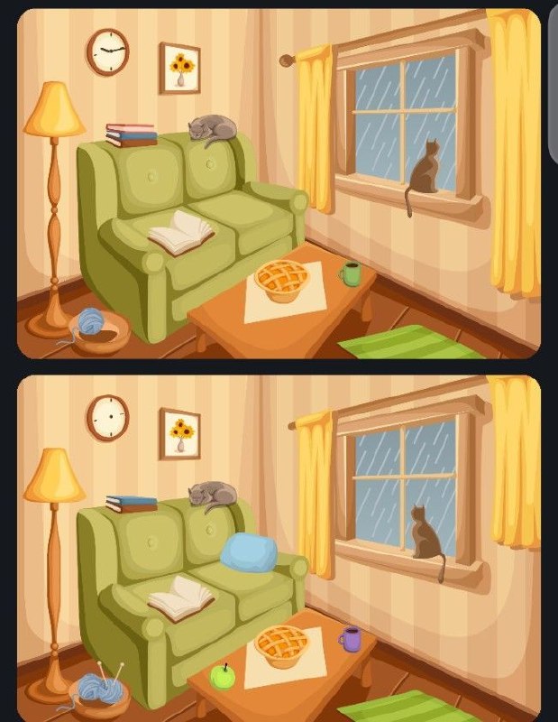 De katten zijn op beide afbeeldingen aanwezig: één ligt op de bank en één zit op de vensterbank, maar door de kleine verschillen in de voorwerpen lijkt de sfeer net iets anders.