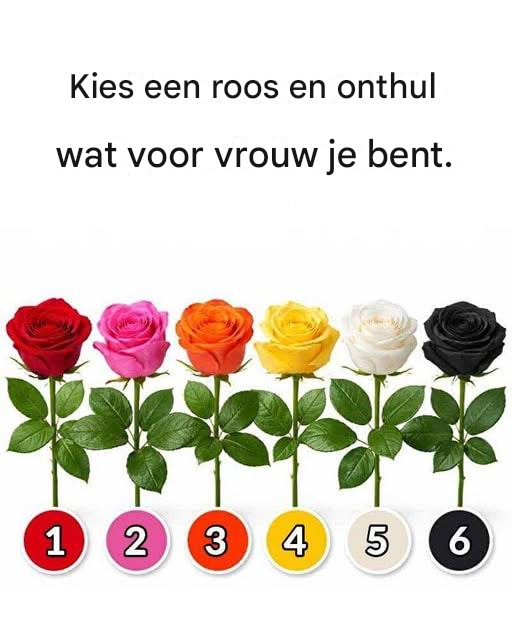 Soms kunnen zelfs onze eenvoudigste keuzes diepgaande aspecten van onze persoonlijkheid onthullen. Kleuren, in het bijzonder, zijn vaak verbonden met onze emoties, waarden en wereldbeeld. Neem even de tijd, bekijk de rozen op de afbeelding en kies de roos die het meest bij je resoneert. Je keuze zou wel eens iets interessants over je persoonlijkheid kunnen onthullen.