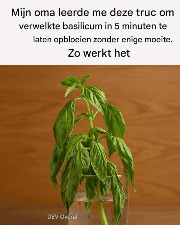 Leg de verwelkte basilicum volledig onder water in de ijskoude kom. Laat de blaadjes drijven of duw ze even onder.
