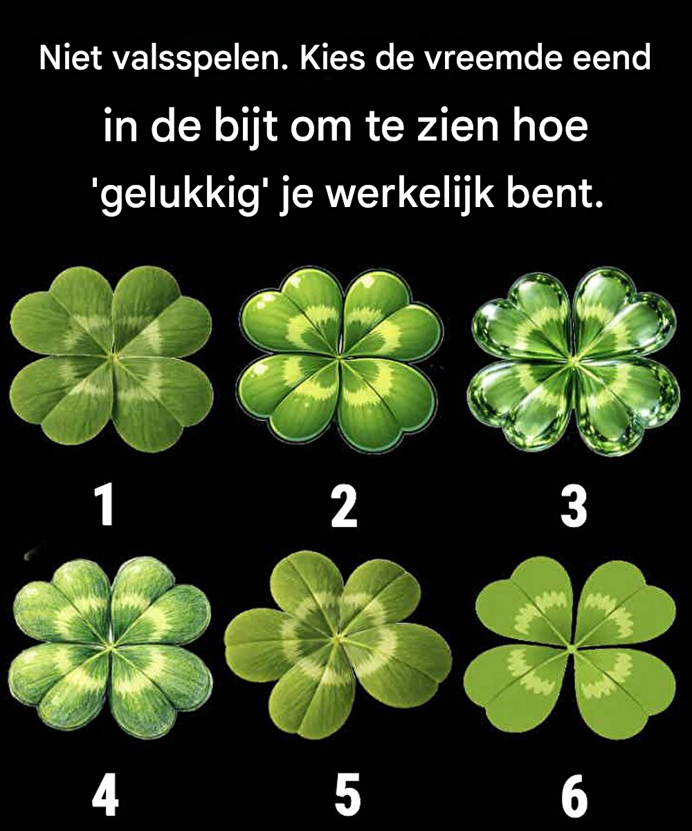 Op het eerste gezicht lijkt de afbeelding een simpel spel: zes klavertjes vier, elk net iets anders, en één uitdaging: zoek de afwijkende. Maar onder deze speelse test schuilt iets intrigerender. Het gaat niet echt om geluk... het gaat om waarneming, intuïtie en persoonlijkheid.