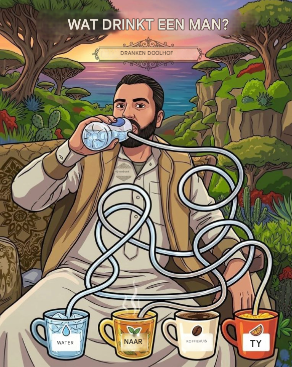 Deze afbeelding is een spel van observatie en logica. Je moet elke leiding volgen om het juiste antwoord te vinden. In dit geval kunnen we, na de verbindingen zorgvuldig te hebben onderzocht, concluderen dat de drank die de man drinkt water is.