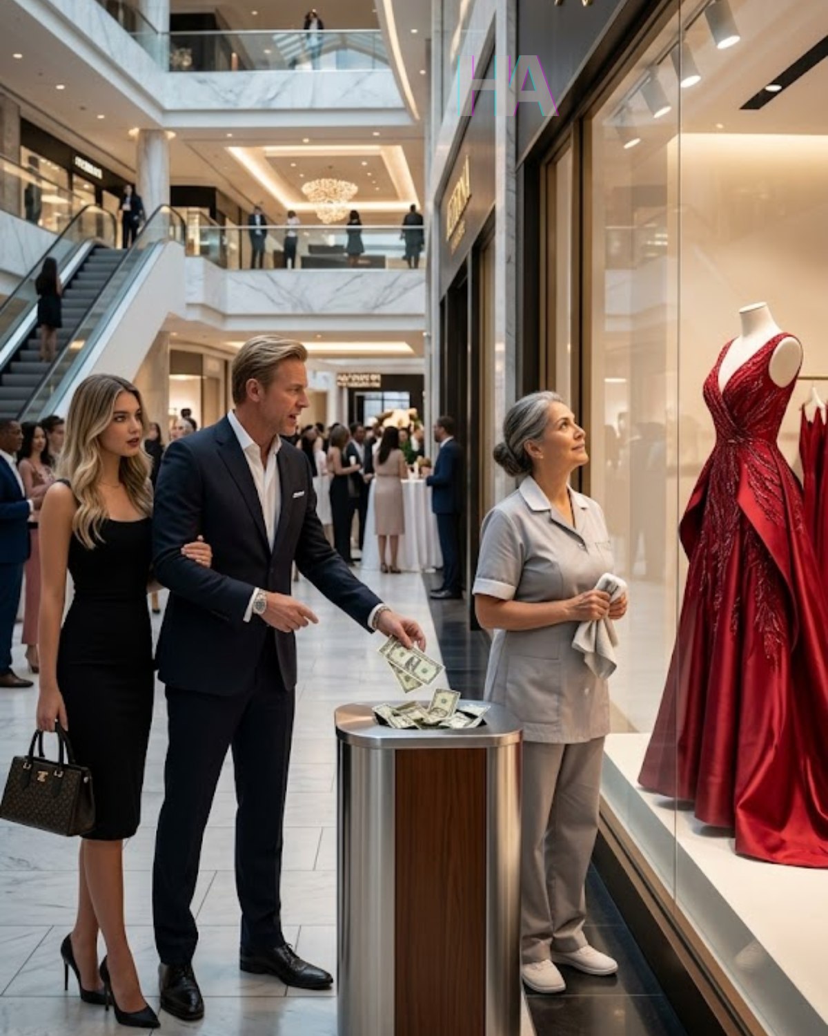 Ze stond roerloos voor een winkelraam, in haar eenvoudige grijze schoonmaakstersuniform, een doek in haar hand. Haar rug was recht. Haar donkere haar was haastig naar achteren gebonden. Niets aan haar was opzichtig, niets dat de aandacht had moeten trekken in deze tempel van luxe, en toch viel je blik op haar als een hand die instinctief een oud litteken bedekt.